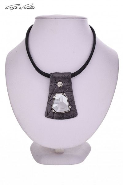 1617-es cikkszámú Cango&Rinaldi nyaklánc ashton antracit és fekete színű minőségi bőr kombinációjából. A nyaklánc közepén egy nikkel színű fém foglalatban egy darab különleges csiszolású és formájú króm színű kristály található. A nyaklánc méretei: 410 mm hosszú, 5 mm széles, mely mágneses hengerzárral kapcsolható, medál hossza: 65 mm. A nyaklánc nikkel színű fém kiegészítőkkel készült, ahol a foglalat C&R feirattal és márkajelzett szegeccsel ellátott, jelezve ezzel a brand eredetiségét és minőségét.