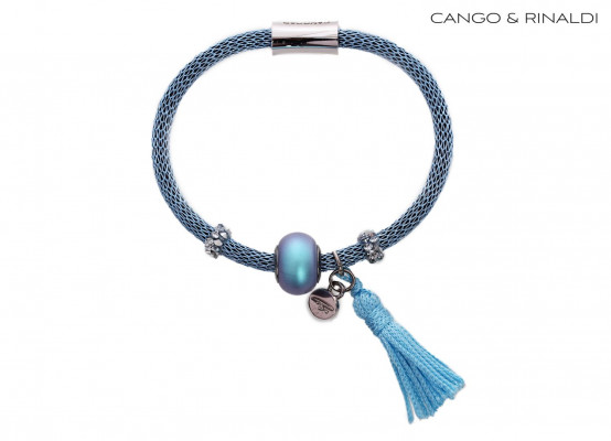 1849-es cikkszámú Cango&Rinaldi huzalból készült karkötő kék színben. A karkötő egy kék (Iridescent Light Blue) színű gyönggyel- valamint fehér színű Crystal Rock kövezéssel díszítve. Nikkel színű mágneses záródással. A karkötő egy kék rojttal és egy nikkel színű, fém Cango felirattal díszített charm található, jelölve ezzel a brand eredetiségét és minőségét.