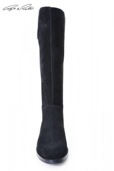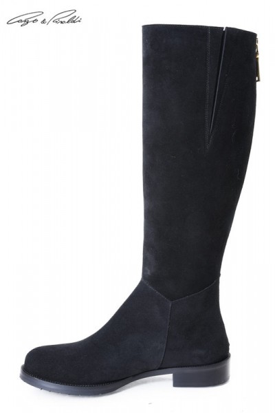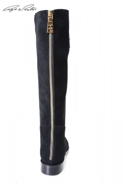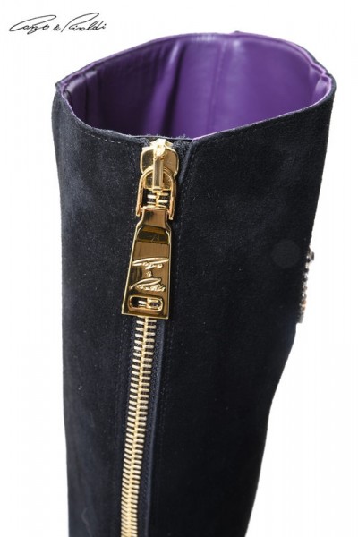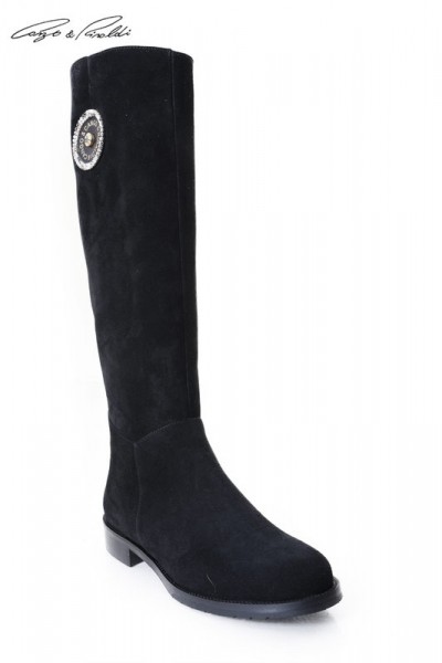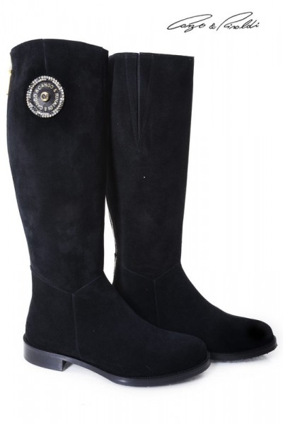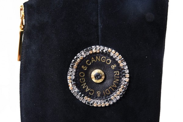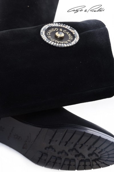 Cango&Rinaldi kézi készítésű bőr lovaglócsizma, fekete színű nubuk bőr alapanyagból. Belebújós, hátulján zipzárral, egyik oldalán gumis panel található, oldalán kör alakú Cango&Rinaldi logó található, melyek v multi ( arany-fehér-black diamond) Swarovski kristállyal díszítettek. A csizma kívül és belül is bőr, talpa csúszásmentes gumi. Az egyik legkedveltebb Cango&Rinaldi cipőmodell új 2016. téli megjelenéssel!