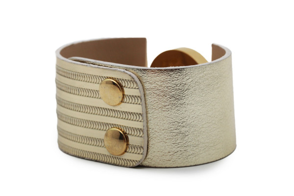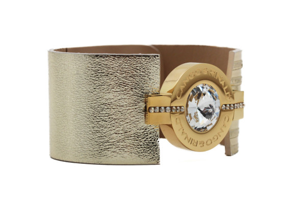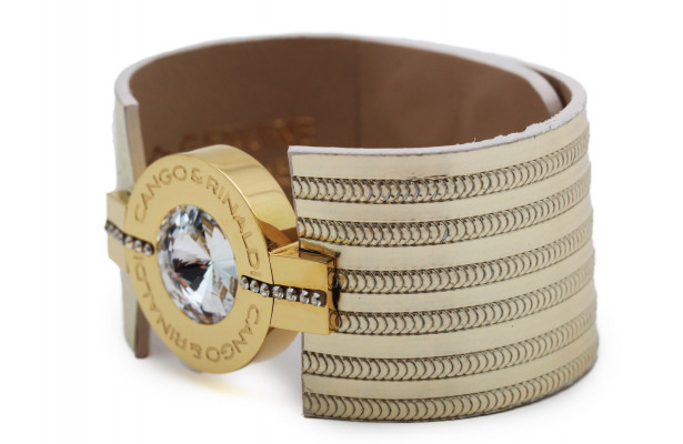B3K cikkszámmal ellátott minőségi olasz bőr karkötő arany és arany csíkos színben, patentos záródással, arany színű fém foglalatban különleges csiszolású fehér színű- és két sorban apró fehér színű kristály díszítéssel. A fémkellékekbe gravírozott Cango&Rinaldi márkafelirat jelöli a brand eredetiségét és minőségét!