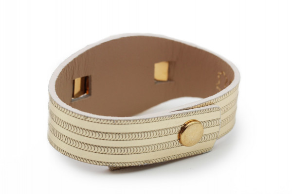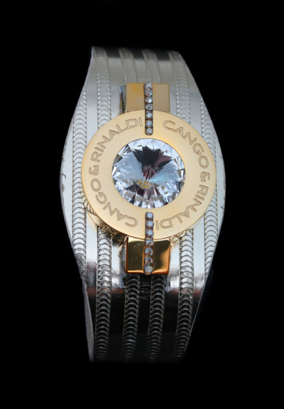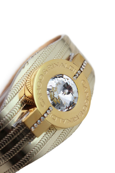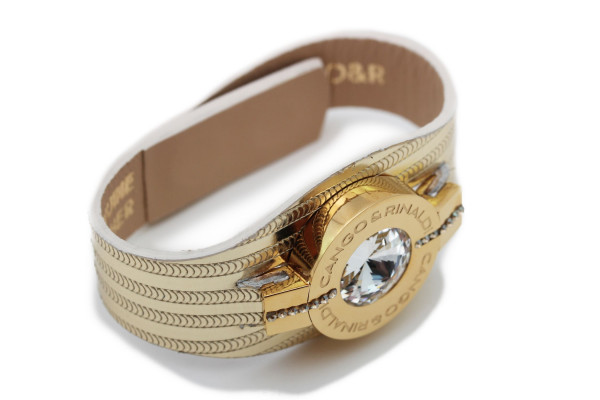 B4K cikkszámmal ellátott karkötő minőségi olasz csíkos bőrből arany színben, patentos záródással, arany színű fém foglalatban különleges csiszolású fehér színű- és két sorban apró fehér színű kristály díszítéssel. A fémkellékekbe gravírozott Cango&Rinaldi márkafelirat jelöli a brand eredetiségét és minőségét!