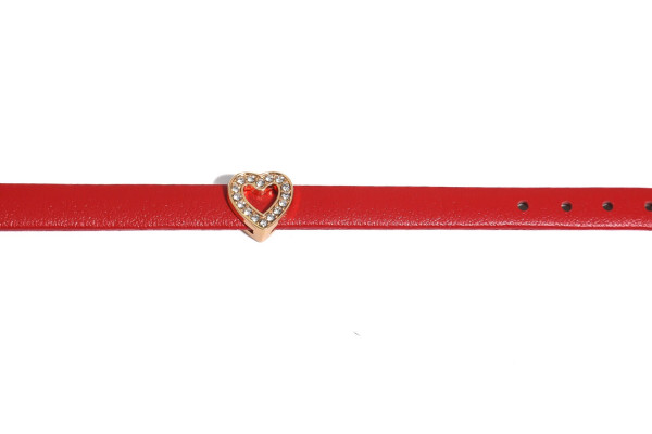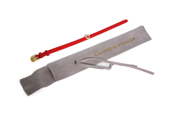 Cango&Rinaldi piros színű olasz bőr pánt a - Charm Kollekcióból - melyet szív formájú fehér színű Swarovski kristályokkal kirakott charm díszít. A karkötő arany színű fémkellékkel készült. Ez a karkötő egyedi és személyes stílust kölcsönöz viselőjének. A karkötő lehetővé teszi, hogy a viselő a charmokkal egyedi emlékeket és történeteket osszon meg.