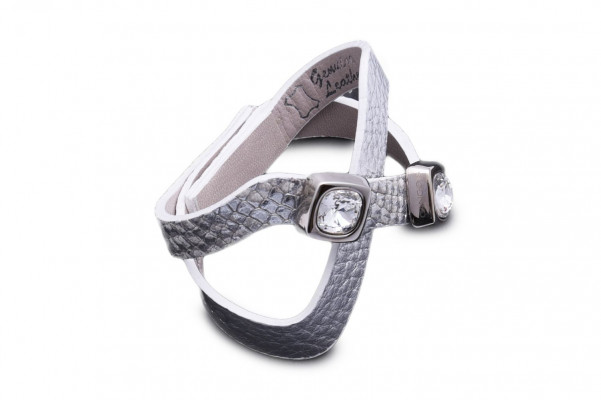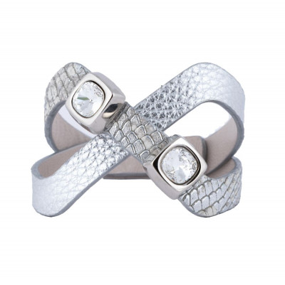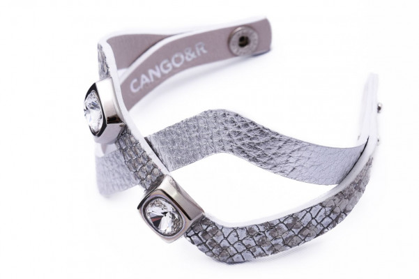 CU03AK cikkszámú Cango&Rinaldi - CUBE KOLLEKCIÓ - karkötő. Ezüst és ezüst piton mintás olasz bőrből, 2 db kocka alakú nikkel színű fémkellékben 2 db fehér színű különleges csiszolású kocka formájú kristállyal díszített. A fém foglalatok Cango&Rinaldi gravírozással ellátott ami jelöli a brand eredetiségét és minőségét!