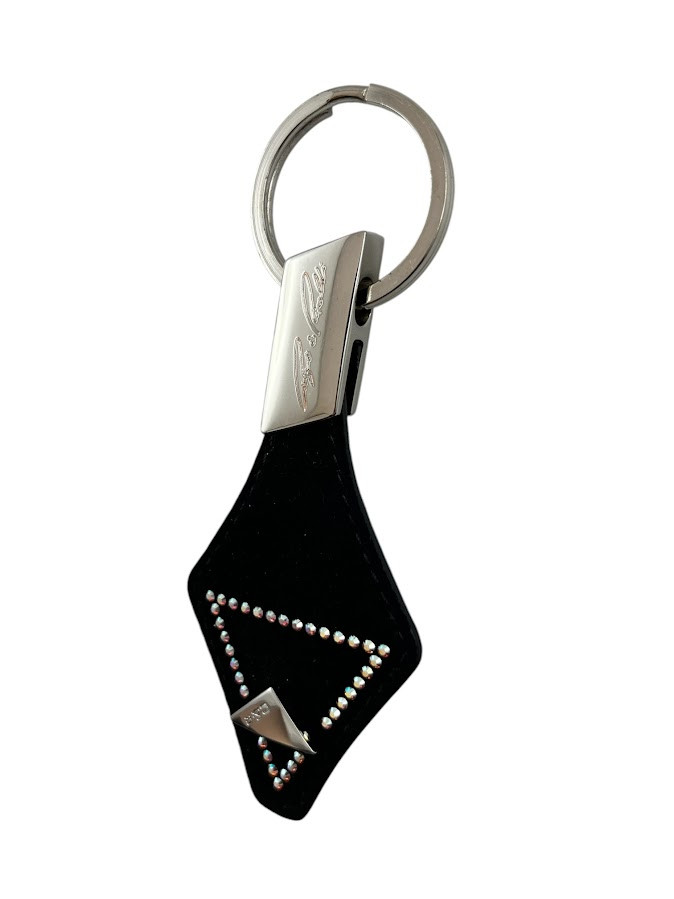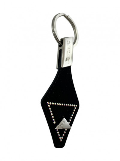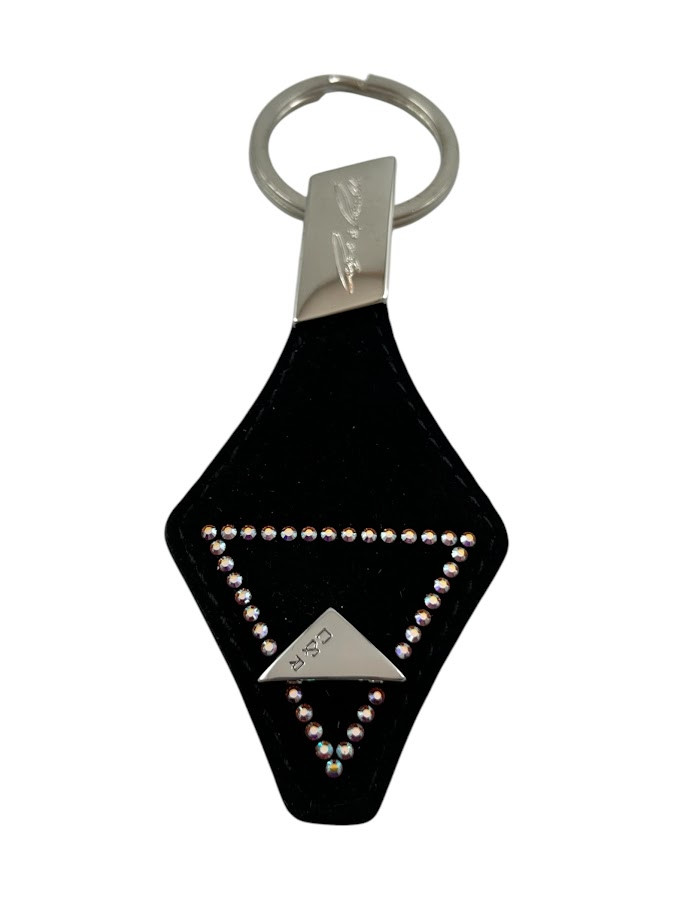 Cango&Rinaldi kulcstartó fekete színű, minőségi olasz nubuk bőrből, nikkel színű fémkellékkel. A bőrön egy C&R gravírozással ellátott fém szegecs és apró színváltós (AB) kristályos díszítés található.
