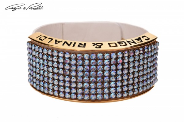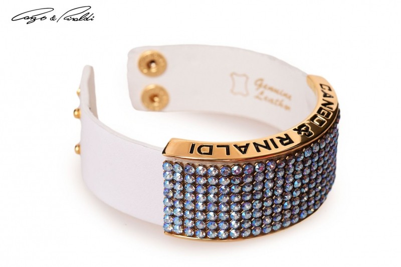 0163-as cikkszámú Cango&Rinaldi karkötő. Fehér színű olasz bőrből, merev arany színű fém foglalat, színváltós Swarovski kristállyal díszítve, patentos kapoccsal. Bőr: fehér színű olasz bőr Kő: színváltós Swarovski kristály. 2 méretben állatható (1. méret: 173 mm 2. méret 188 mm). Szélesség: 30 mm Hossz: 210 mm Swarovski kövekkel kirakott felület: 80*23 mm.