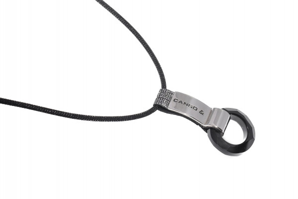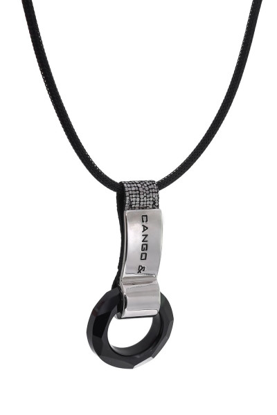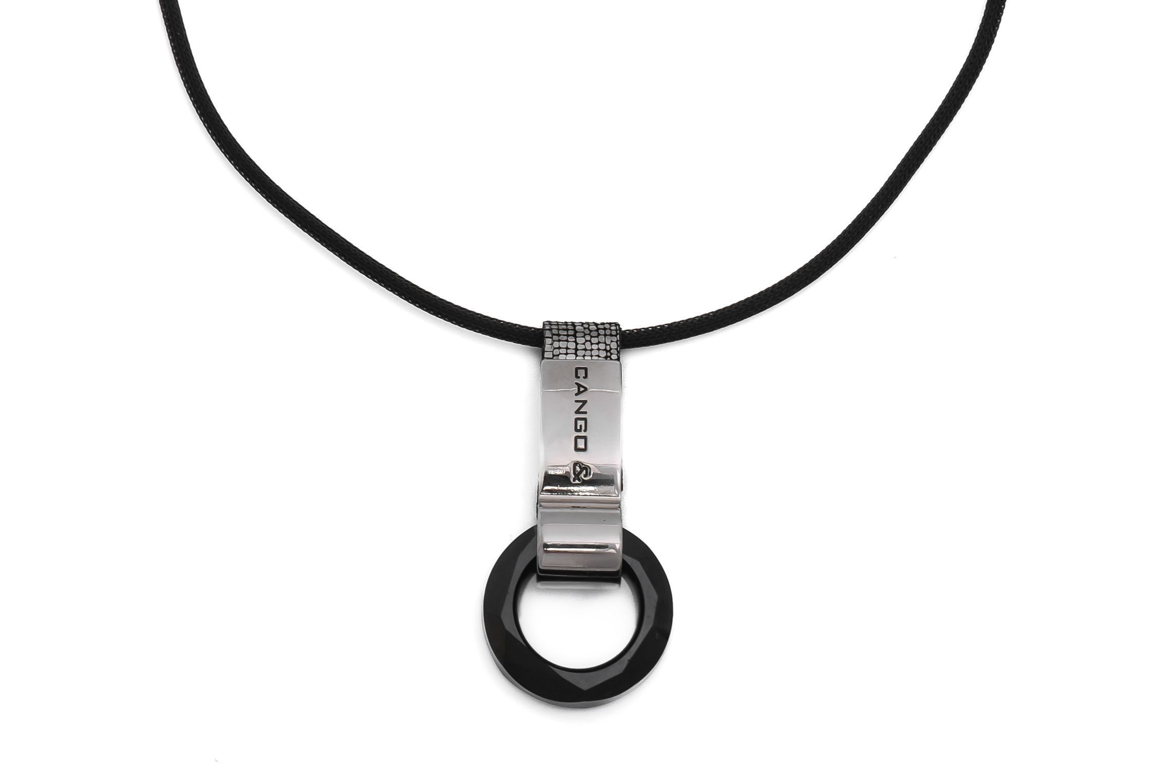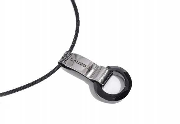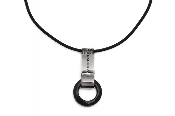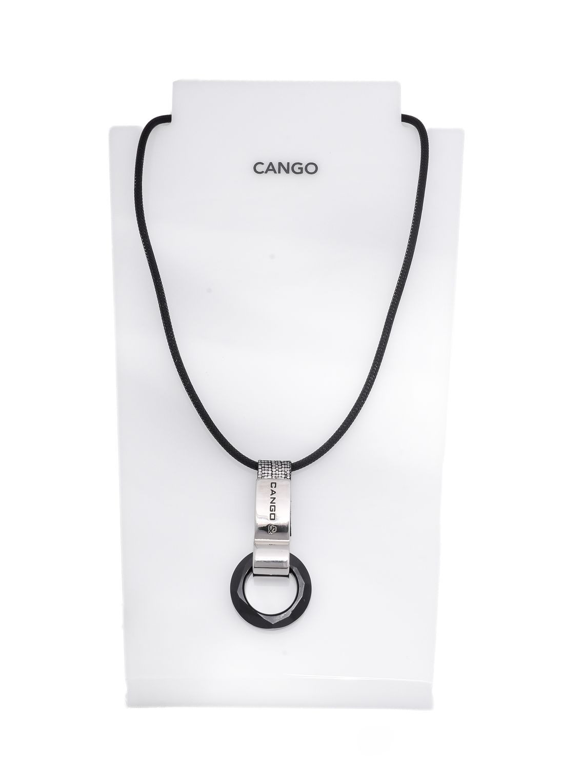 Cango&Rinaldi nyaklánc fekete színű huzalból, amelyet króm mintás minőségi olasz bőrön nikkel színű fém foglalatban különleges csiszolású kör alakú fekete színű kő díszít. A fémkellékeken található gravírozott Cango& és Cango&R márkafeliratok jelölik a brand eredetiséget és minőséget.