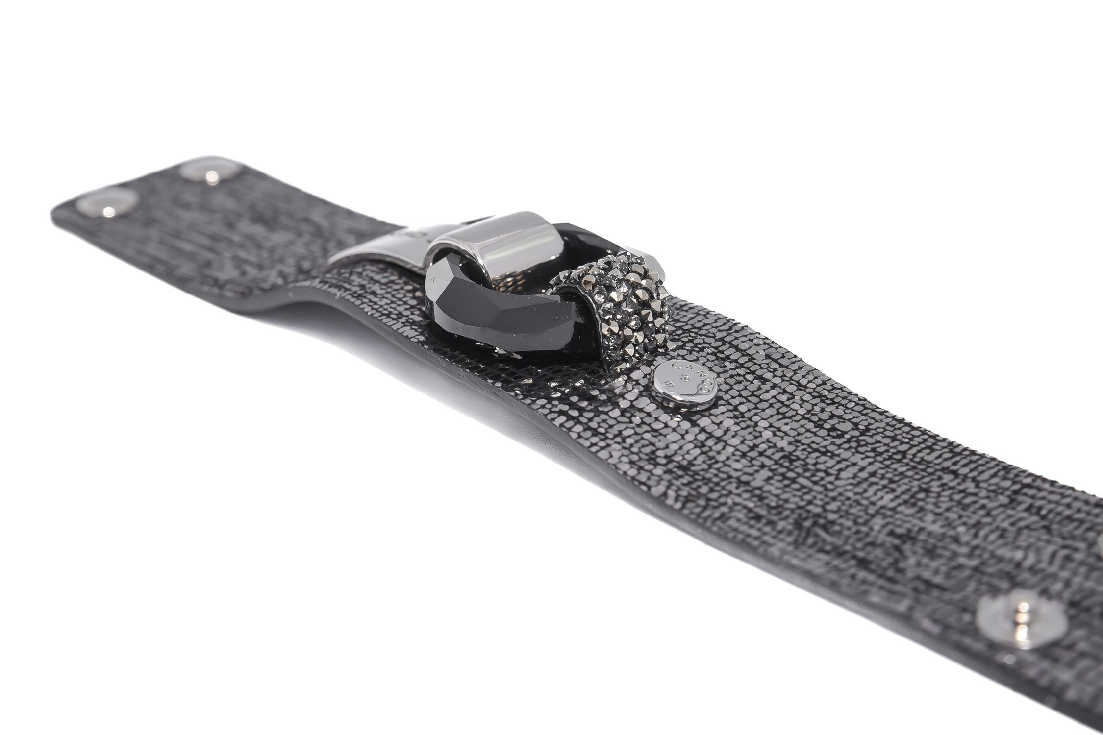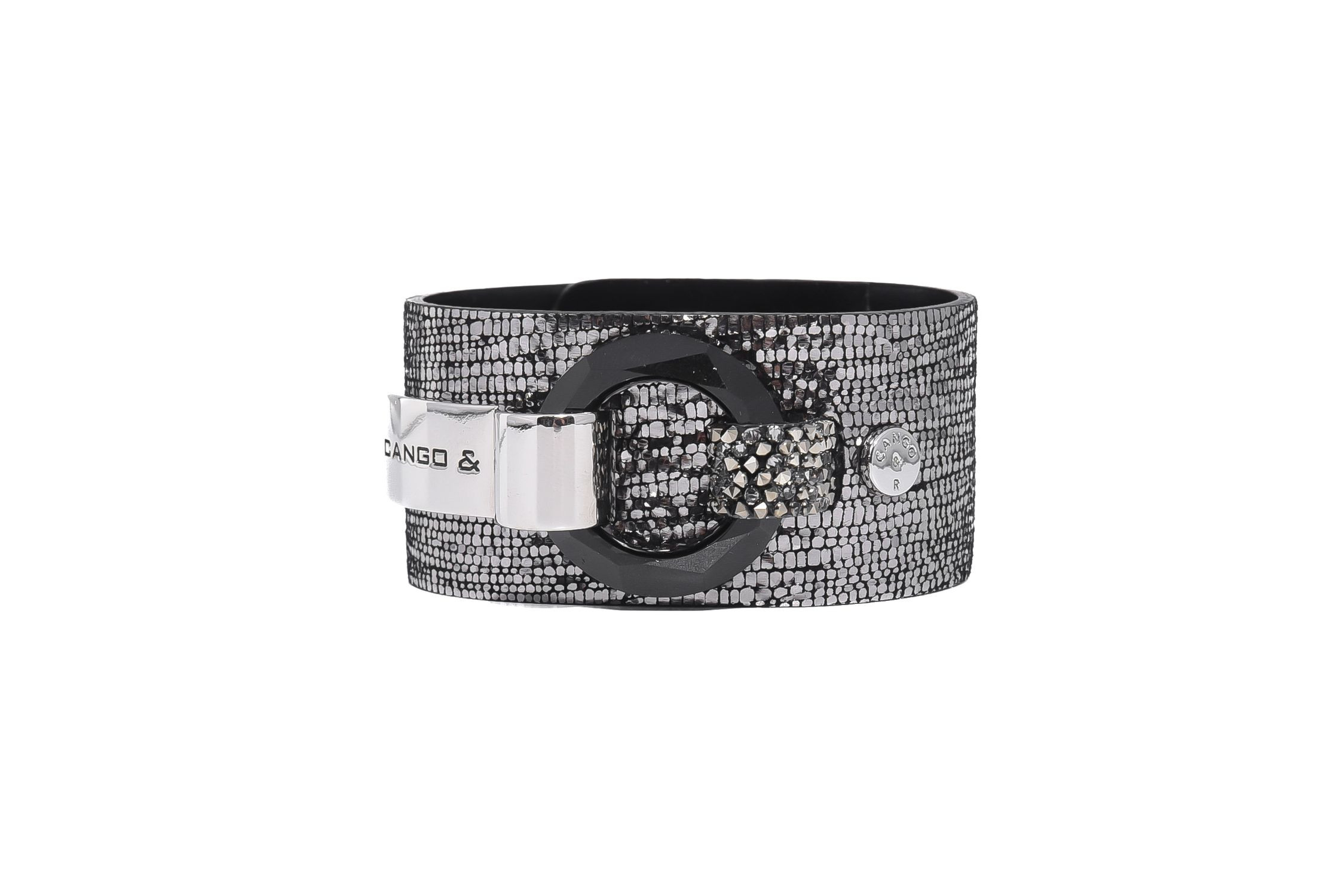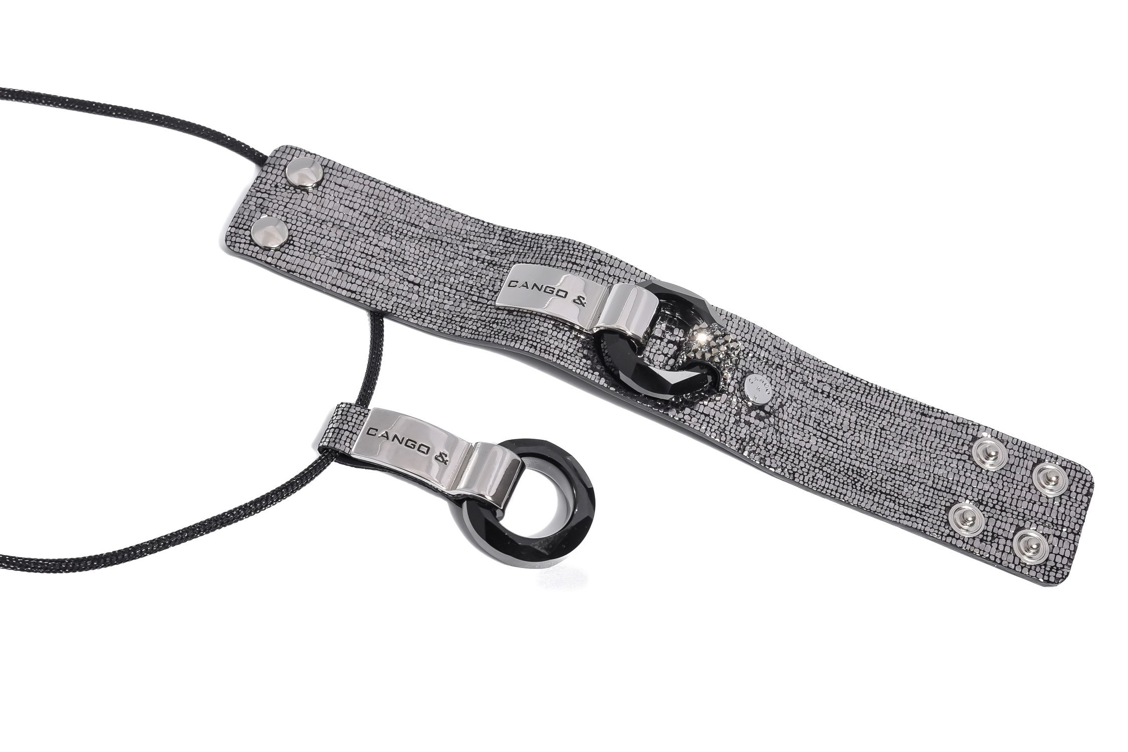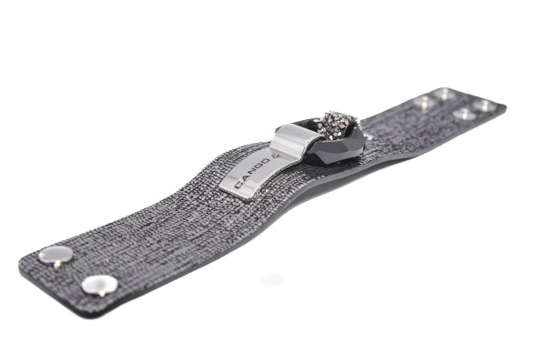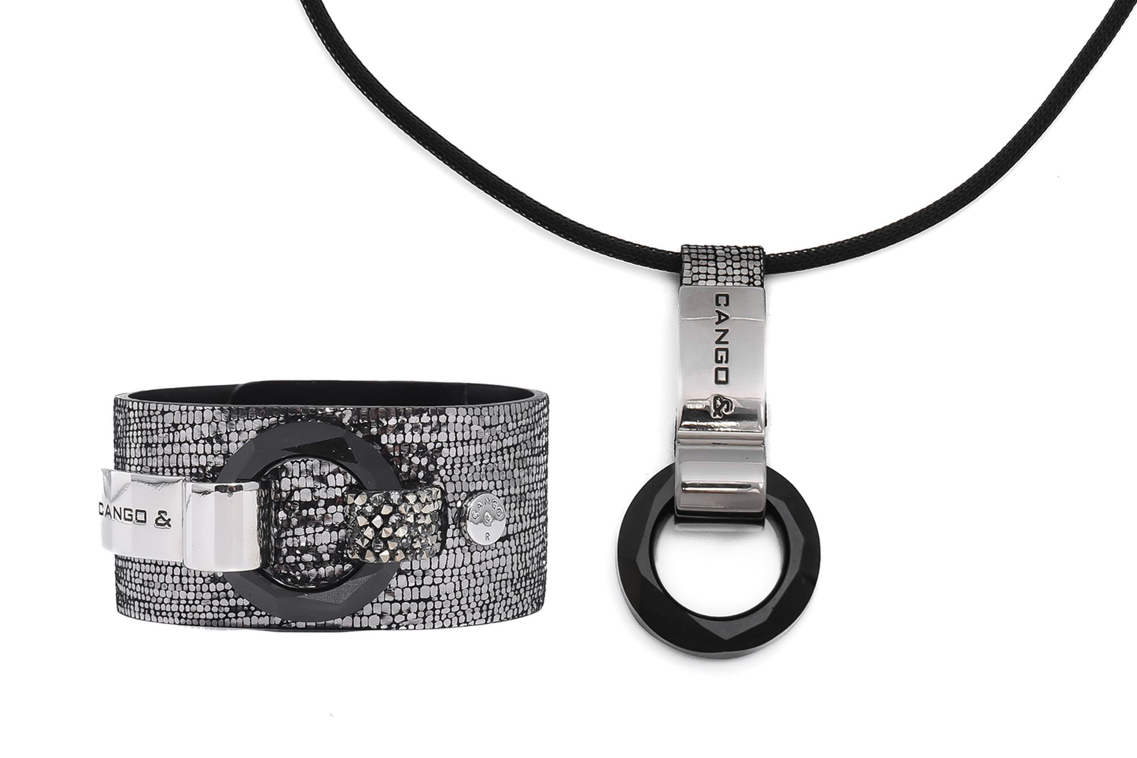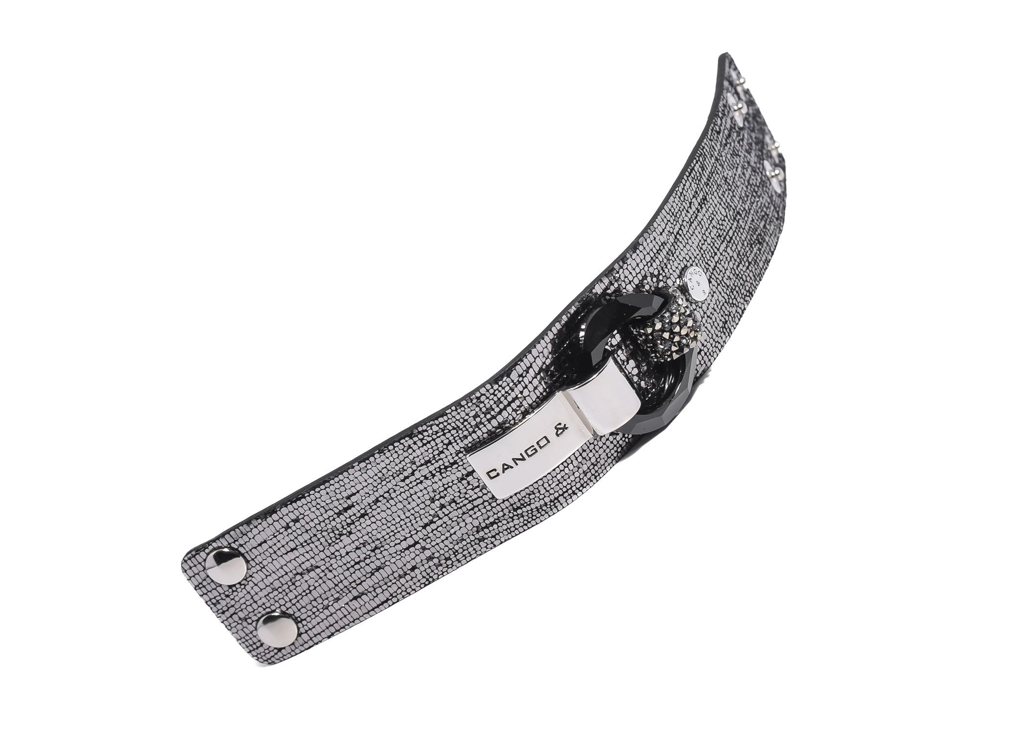Cango&Rinaldi karkötő króm mintás minőségi olasz bőrből, amelyet középen egy nikkel színű fém foglalatban különleges csiszolású kör alakú fekete színű kő és ve multi d szilánk formájú Crystal Rock Swarovski kristályok díszítenek. A fémkellékeken lévő gravírozott Cango& és Cango&R márka feliratok jelölik a brand eredetiséget és minőséget.