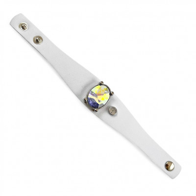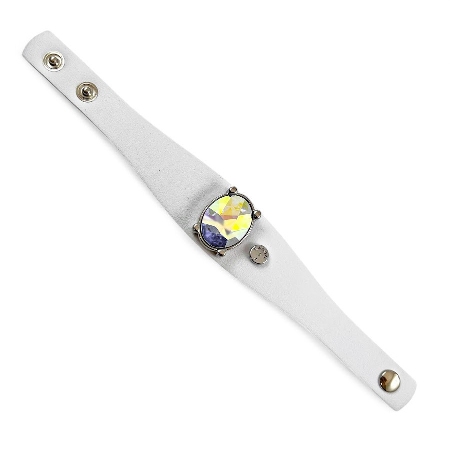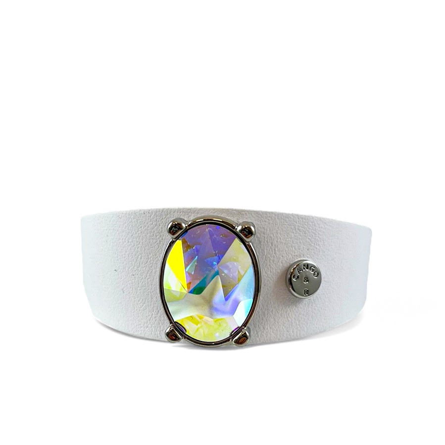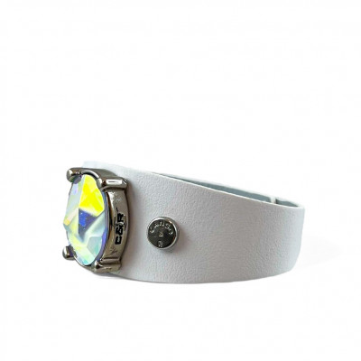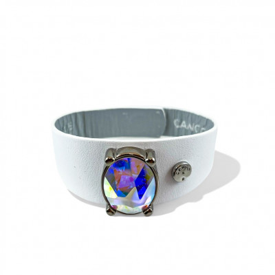 Cango&Rinaldi karkötő fehér színű minőségi olasz bőrből, amelynek közepén egy nikkel színű fém foglalatban különleges csiszolású és formájú színváltós (AB) színű Swarovski kristály található, amelyen finom, apró vésés található. A kő kis része ékszerészeti precizitással lett megmunkálva, így egy igazán különleges, személyre szabott darabot kaptunk. A vésés nemcsak a kő természetes szépségét emeli ki, hanem egyediséget és eleganciát is kölcsönöz neki. A fémkellékbe gravírozott Cango&R márkafelirat jelöli a brand eredetiséget és minőséget.