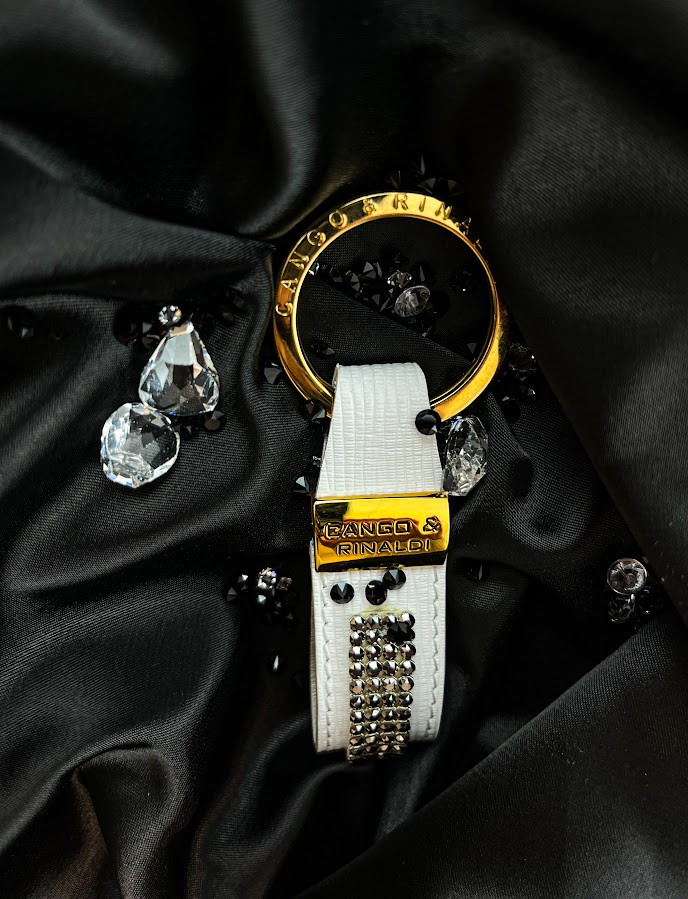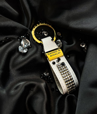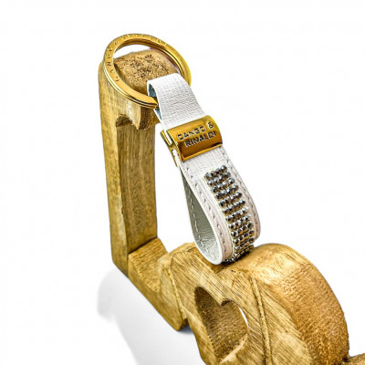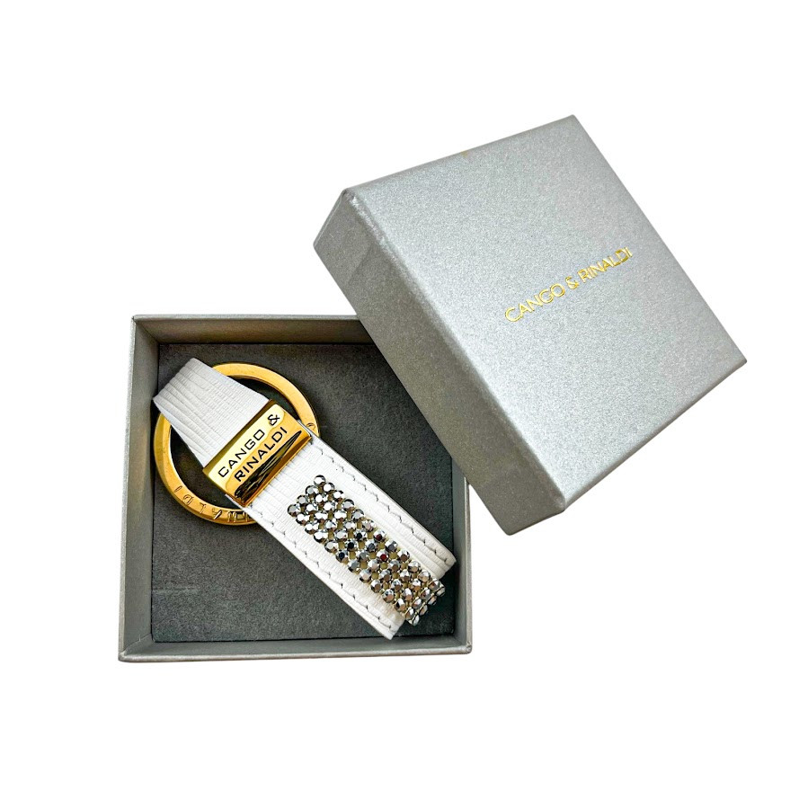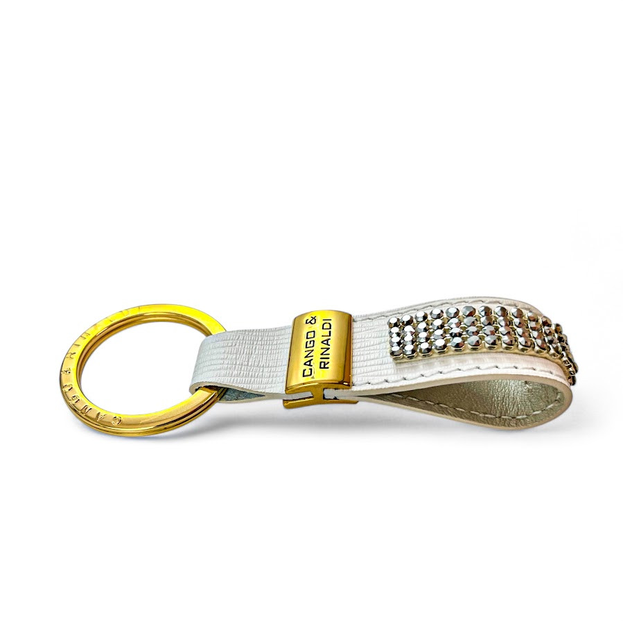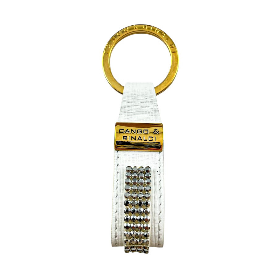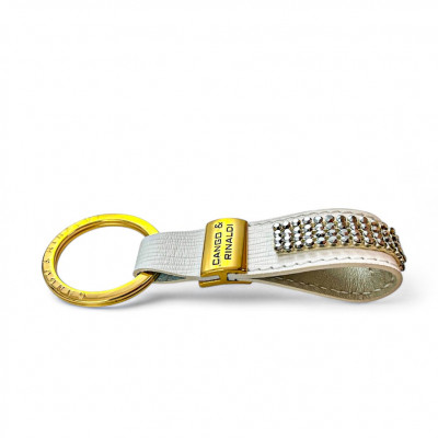 Cango&Rinaldi fehér színű valódi olasz texturált bőr kulcstartó, arany színű fém kiegészítőkkel, ezüst metál színű mesh kövezésű kristállyal díszítve.