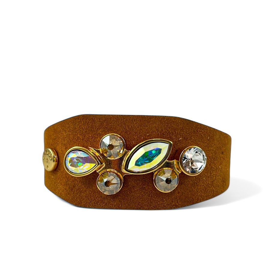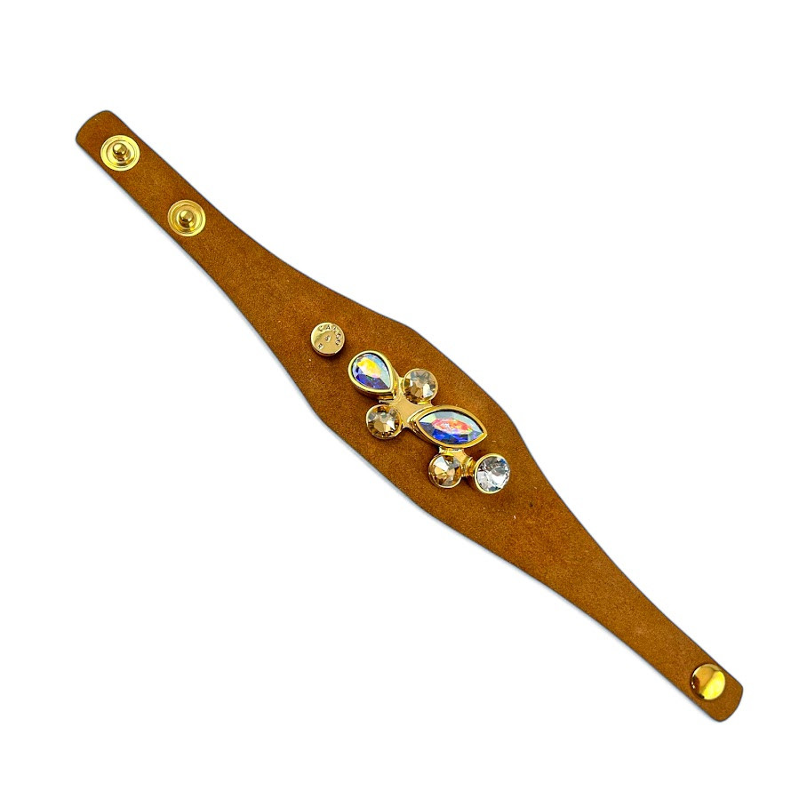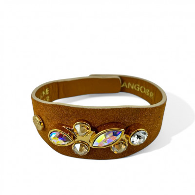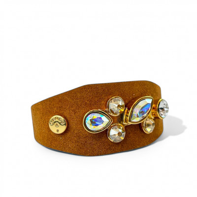 Cango&Rinaldi karkötő, amely csaubarna színű minőségi olasz bőrből készült, közepén egy arany színű fém foglalatban különleges csiszolású fehér (001), színváltós (AB) és arany színű Swarovski kövekkel díszítve.