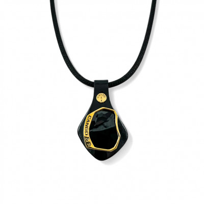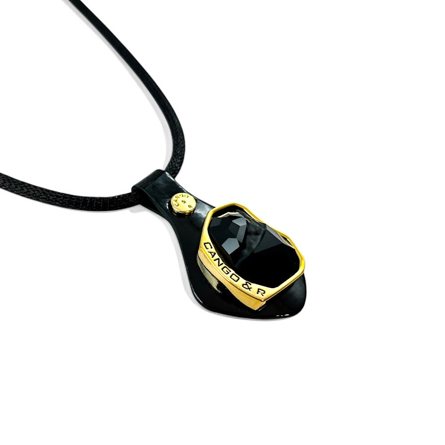 Cango&Rinaldi nyaklánc fekete színű huzalon, melyet fekete színű minőségi olasz lakk bőrön, arany színű fém foglalatban egy nagyobb méretű, különleges csiszolású és vésett króm felületű, fekete (jet) színű Swarovski kristály díszít.