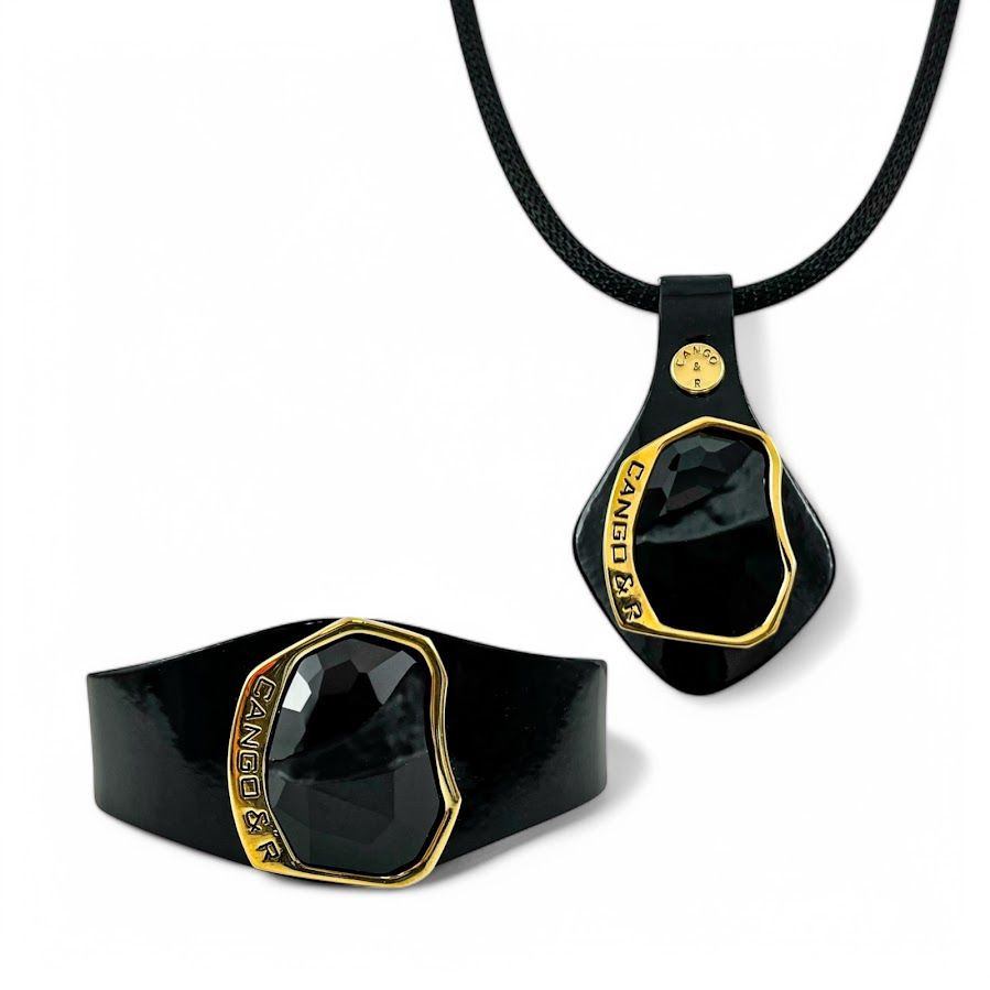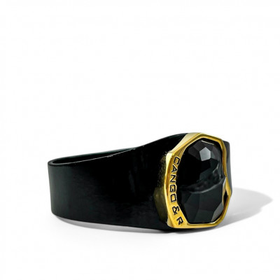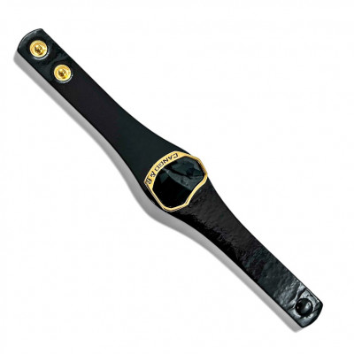 Cango&Rinaldi karkötő, amely fekete színű minőségi olasz lakk bőrből készült, közepén arany színű fém foglalatban egy nagyobb méretű, különleges csiszolású és vésett króm felületű, fekete (jet) színű Swarovski kristály díszít.