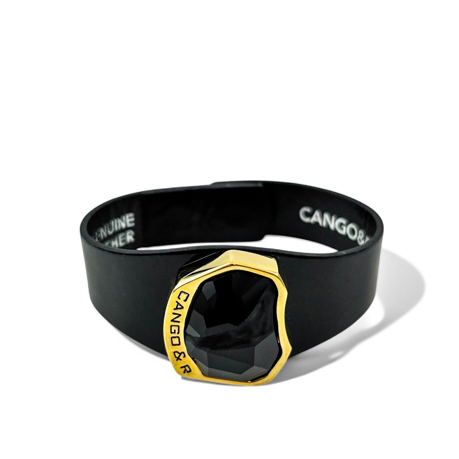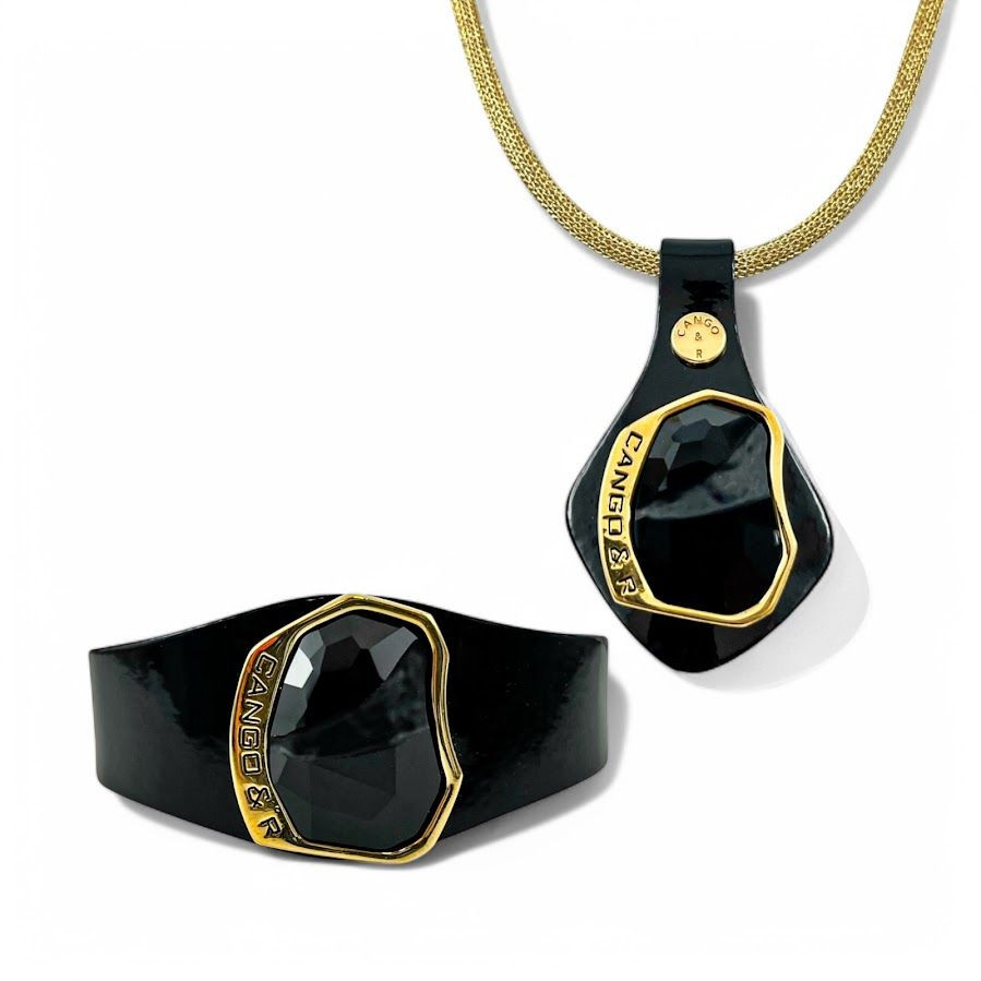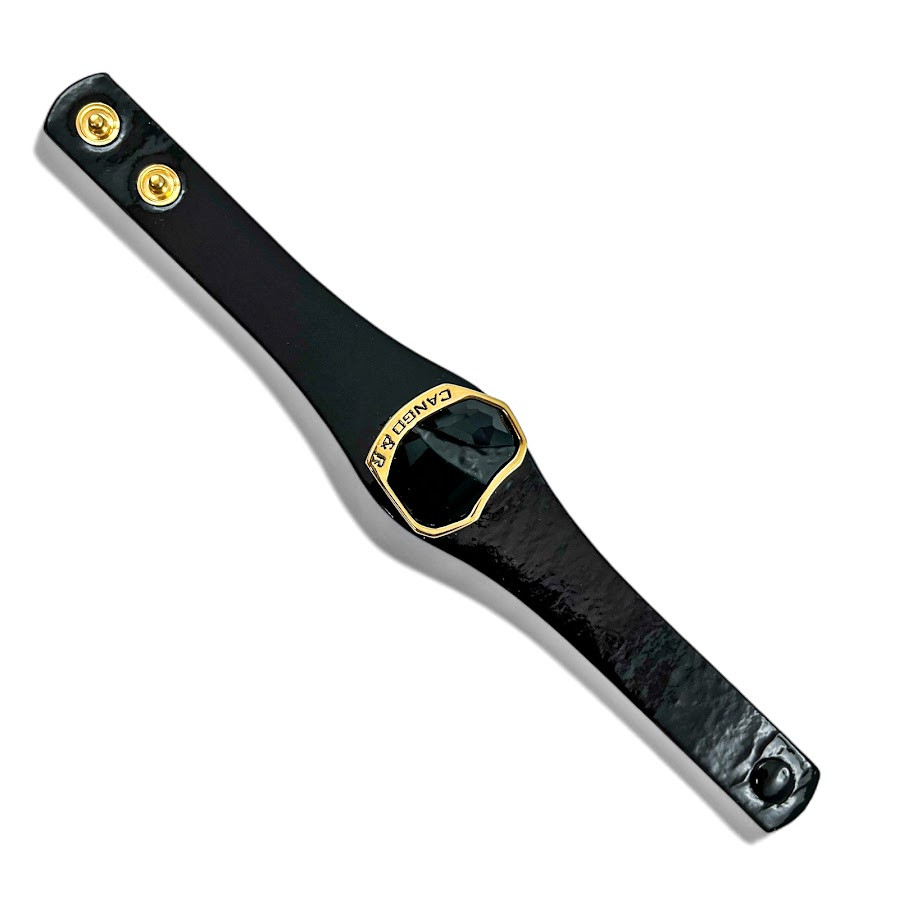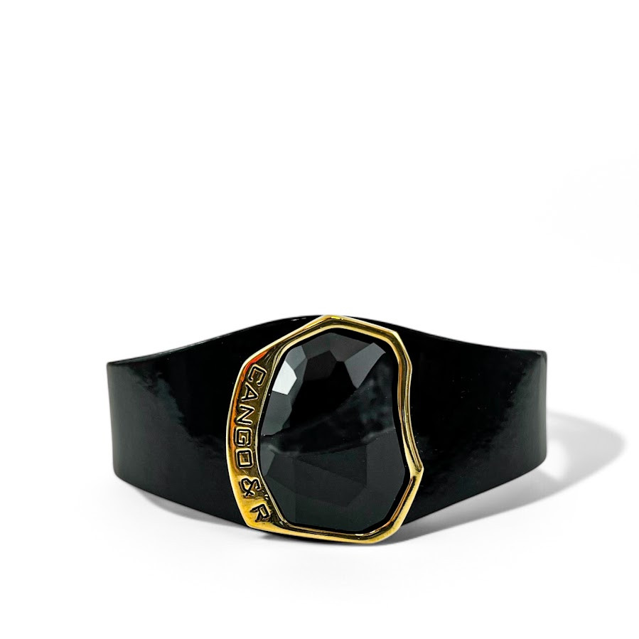 Cango&Rinaldi karkötő, amely fekete színű minőségi olasz lakk bőrből készült, közepén arany színű fém foglalatban egy nagyobb méretű, különleges csiszolású és vésett, fekete (jet) színű Swarovski kristály díszít.