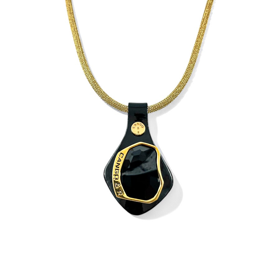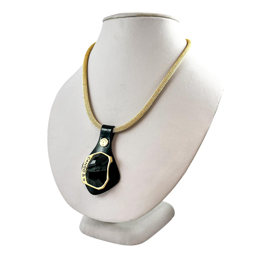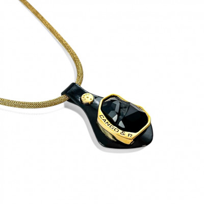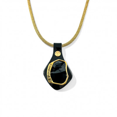 Cango&Rinaldi nyaklánc arany színű huzalon, melyet fekete színű minőségi olasz lakk bőrön, arany színű fém foglalatban egy nagyobb méretű, különleges csiszolású és vésett fekete (jet) színű Swarovski kristály díszít.