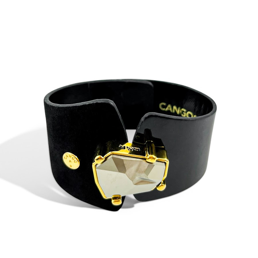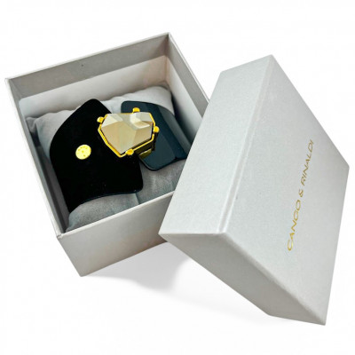 Cango&Rinaldi karkötő, amely fekete színű minőségi olasz lakk és nubuk bőrök kombinációjából készült, közepén egy arany színű fém foglalatban egy nagyobb méretű, különleges csiszolású és vésett króm felületű metal gold színű Swarovski kristály díszíti.