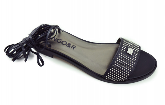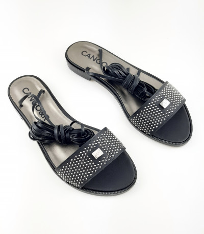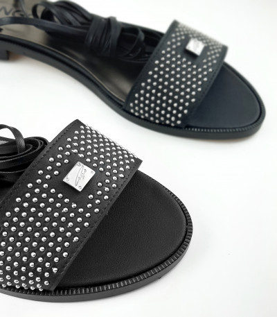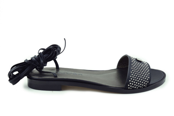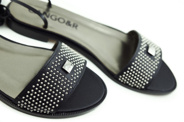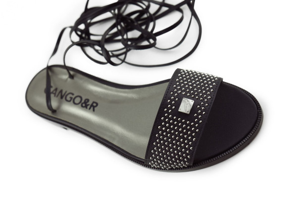 Cango&Rinaldi kézi készítésű fekete színű nappabőr szandál bőr talppal; nikkel színű szegecsekkel kirakott széles pánttal; a bokán több soron körbetekerhető keskeny pánttal, ami szabadon alakítható, egy éles ollóval ~45°-os szögben elvágva rövidebbre vehető; Cango gravírozással ellátott fém táblával, mely jelöli a brand eredetiségét és minőségét!