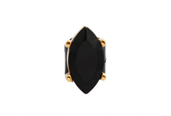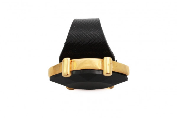 CRBA1475-as cikkszámú Cango&Rinaldi gyűrű. A termék a Dukai Regina kollekció részét képezi. Lakk prada fekete színű olasz bőrből készült, a bőr közepén arany fémmel ellátott, hosszúkás formájú fekete színű különleges csiszolású kövezéssel díszített. Gyűrű méretei: 10 mm széles, fejének mérete: 20*30 mm.