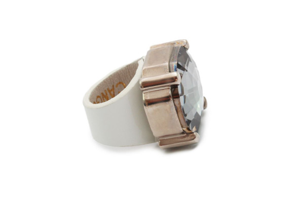 CRBA1477 cikkszámú Cango&Rinaldi gyűrű. A termék a 2017-es Dukai Regina kollekció részét képezi. Fehér színű olasz lakk bőrből készült, a bőr közepén nikkel színű fémmel ellátott, kerek formájú Silver Night színű különleges csiszolású kövezéssel díszített. Méret: 56-os belső átmérő: 17,83 mm. Gyűrű méretei: 10 mm széles, fejének mérete: 22*22 mm.