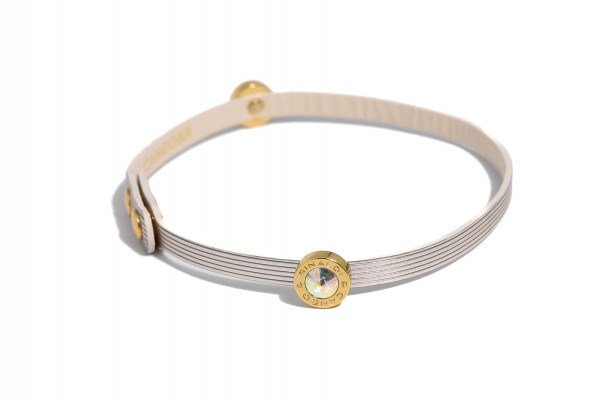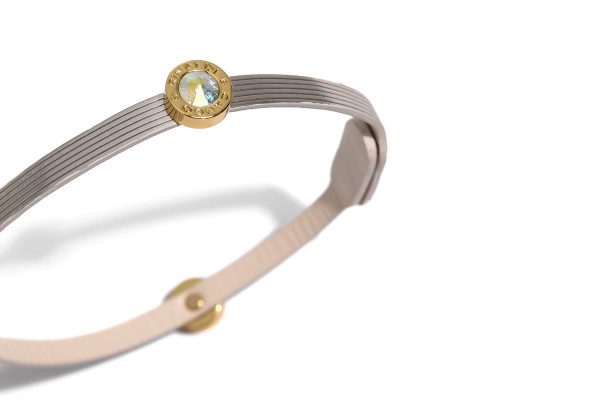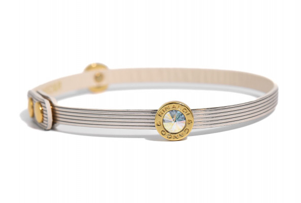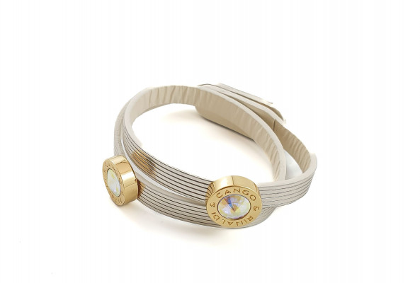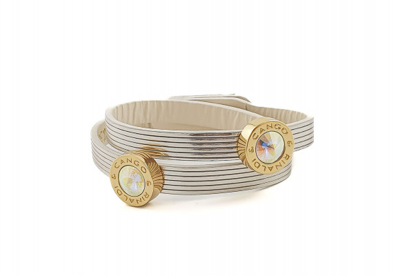 GL8K cikkszámmal ellátott duplasoros karkötő minőségi olasz csíkos bőrből arany színben, patentos záródással, arany színű fémfoglalatokkal, benne különleges csiszolású, színváltós (AB) színű kristályos díszítéssel. A fémkellékekbe gravírozott Cango&Rinaldi márkafelirat jelöli a brand eredetiségét és minőségét!