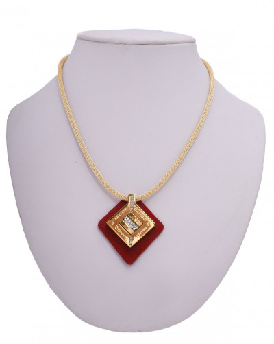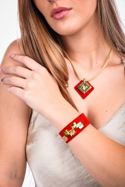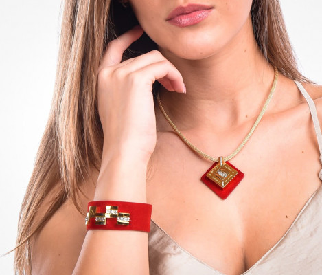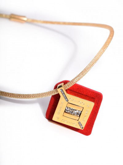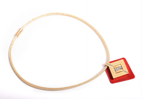 Cango&Rinaldi - Mozaik kollekciójában található nyaklánc egy arany színű huzalon található tűz piros színű minőségi olasz nubuk bőrön fehér színű Crystal Rock kövezéssel és Cango&Rinaldi gravírozással ellátott arany színű fémkellék található, a gravírozás jelöli brand eredetiségét és minőségét.
