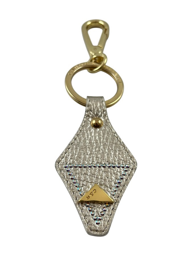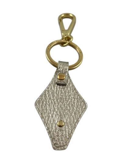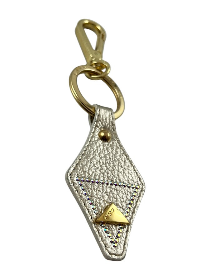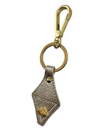 Cango&Rinaldi kulcstartó arany színű, minőségi gyűrt olasz bőrből, arany színű fémkellékkel. A bőrön egy C&R gravírozással ellátott fém szegecs és apró színváltós (AB) kristályos díszítés található.