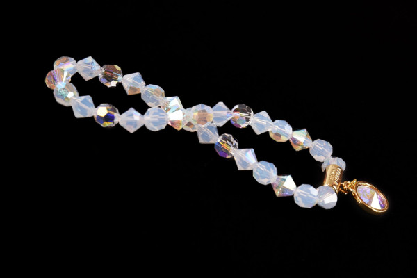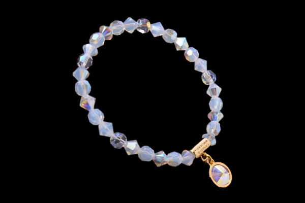 Cango&Rinaldi karkötő a ─ Sunshine kollekcióból ─; különleges csiszolású, opál fehér színű kristályokkal; egysoros fazonban; arany színű fém foglalattal; AB (színváltós) színű kirstályos charm díszítéssel.
