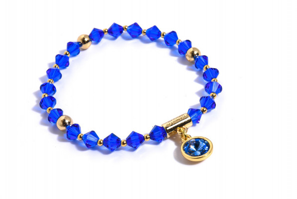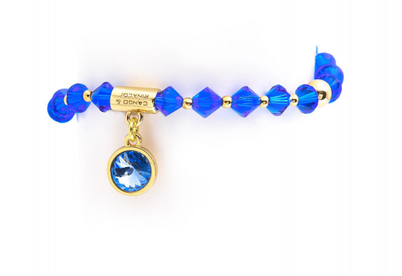 Cango&Rinaldi karkötő a ─ Sunshine kollekcióból ─; különleges csiszolású, királykék színű kristályok és különböző méretű, arany színű fém gyöngyök kombinációjából; egysoros fazonban; arany színű fém foglalattal; királykék színű kirstályos charm díszítéssel.