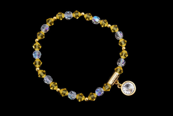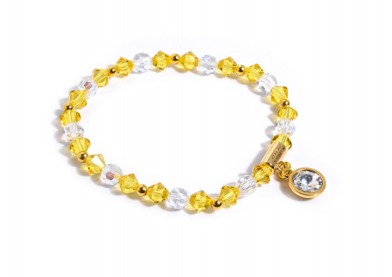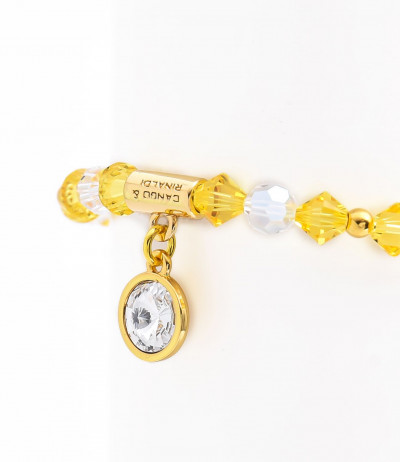 Cango&Rinaldi karkötő a ─ Sunshine kollekcióból ─; különleges csiszolású, napsárga és fehér színű kristályok és apró arany színű fém gyöngyök kombinációjából; egysoros fazonban; arany színű fém foglalattal; fehér színű kirstályos charm díszítéssel.