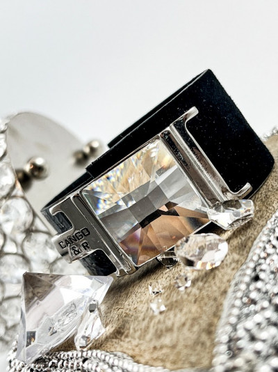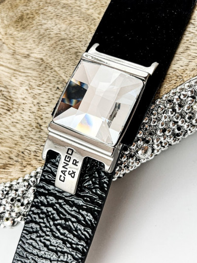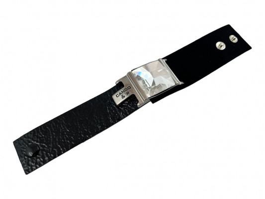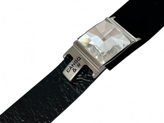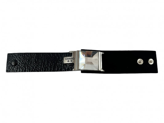 Cango&Rinaldi karkötő a Timeless Kollekcióból, minőségi olasz bőrök kombinációjából, gyűrt lakk fekete és nubuk fekete színben, széles pántján középen nikkel színű fém foglalattal, fehér színű swarovski kristállyal, patentos záródással, mellyel két méretben kapcsolható.